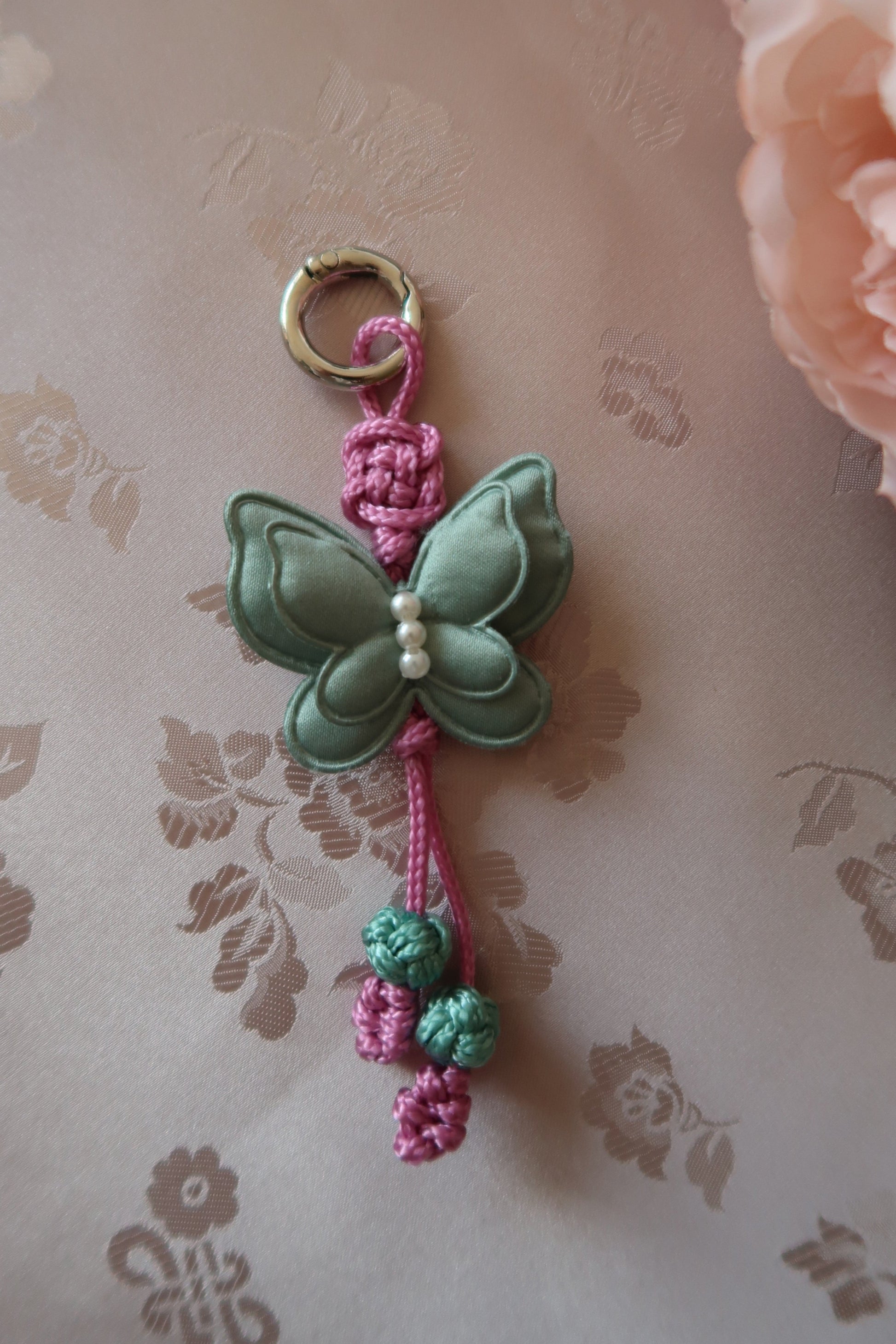 Ce norigae (노리개) est réalisé à la main selon la technique coréenne du maedup, l’art du nœud décoratif.